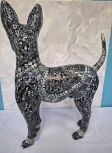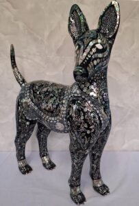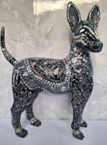 La obra, realizada con la delicada técnica de incrustación de concha de abulón, deslumbró al jurado por su perfección y simbolismo. El Xoloitzcuintle, guardián ancestral y compañero del inframundo en la cosmovisión mexicana, fue representado con maestría en una pieza que reafirma la riqueza del arte popular.