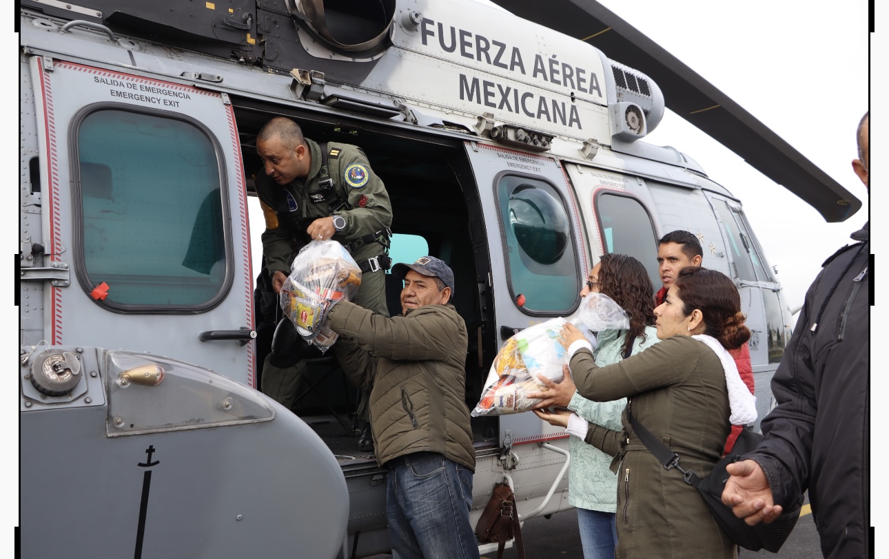 A bordo de un helicóptero Cougar 1007 de la Guardia Nacional (GN), los funcionarios transportan 560 paquetes de alimentos para las familias damnificadas. Paralelamente, un helicóptero Black Hawk, también de la GN, se dirige al municipio de Tianguistengo con 300 despensas.