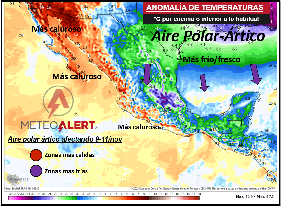 Entre los días 9 y 11 de noviembre, se prevé el ingreso de un nuevo frente frío que estará acompañado de una masa de aire polar-ártica, la cual recorrerá gran parte del territorio nacional, afectando al norte, noreste, occidente, centro, oriente y sureste del país.