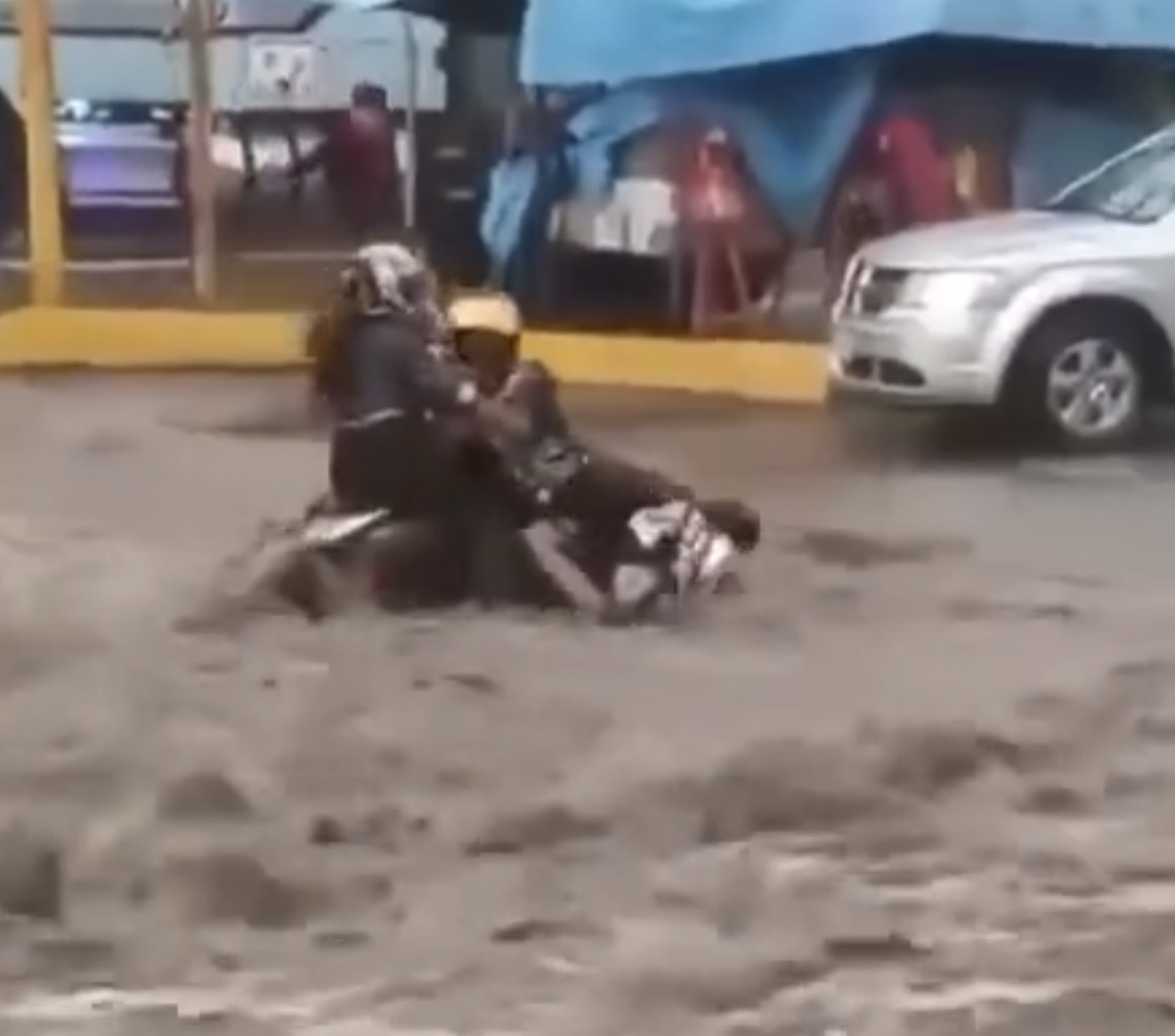 Tultepec, Estado de México.— Una fuerte corriente de agua generada por una intensa tromba sorprendió a una familia que viajaba a bordo de una motoneta la tarde de este martes, dejando momentos de tensión que, afortunadamente, no pasaron a mayores.